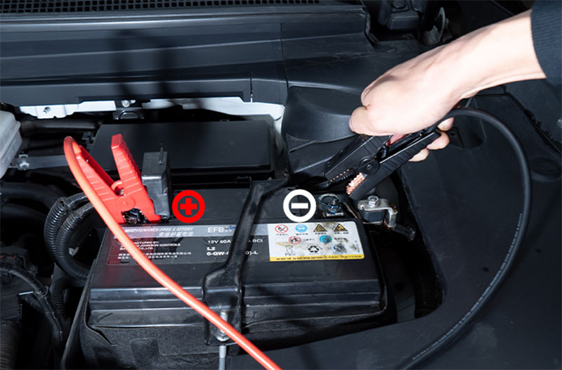 - ジャンプスターターの赤いクランプをバッテリーの+端子に接続