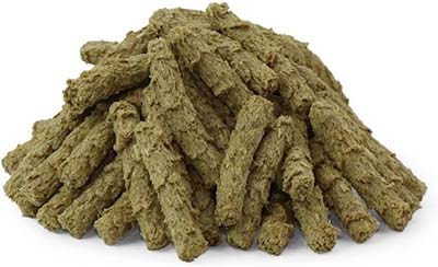 ダブルティモシーの名の通り、2種類のチモシーを配合することで風味と食感に奥行きが出ています。長めに成形されたペレットはうさぎがくわえて食べやすく、食べ残しも少ないと評判です。牧草を食べない子のための最初のステップとしておすすめです。