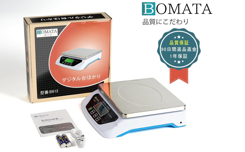 BOMATAのB612Bは、50kgまで1g単位で計れる中型台はかり。 ステンレス製の天板で水洗いできるので、生鮮食品の現場でも衛生管理がラクなのが武器です。 実売1万円台前半で、宅配の梱包重量チェックや小売の量り売りに使える汎用型として人気が出ています。