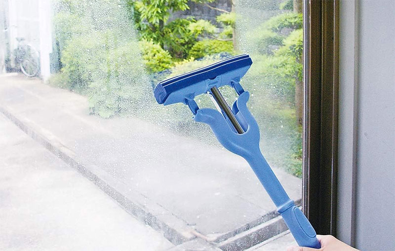 汚れをモップでこすり落としたら、水切りワイパーで仕上げます。ワイパーは左から右へ横方向に動かし、一列拭くごとにゴム部分を乾いた布で拭き取るのがポイント。最後は上から下へ縦方向に水切りして、下の窓枠を拭けば完成です。