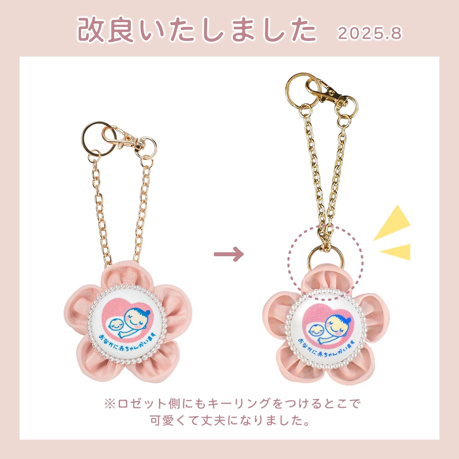 ロゼットタイプはリボンやシフォン素材を使った華やかなデザインで、バッグにつけるだけでおしゃれ度がアップします。アクリルタイプは厚生労働省のマタニティマークをそのまま印刷したもので、視認性が高くシンプルなのが特長です。