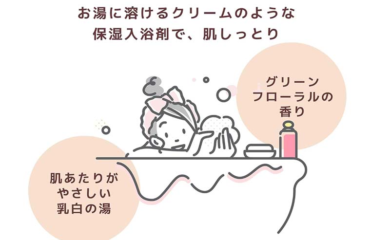 乳白色のやわらかいお湯になり、フローラルのやさしい香りがバスタイムを癒しの時間に変えてくれます。 赤ちゃんとの入浴にも使えるやさしい処方です。