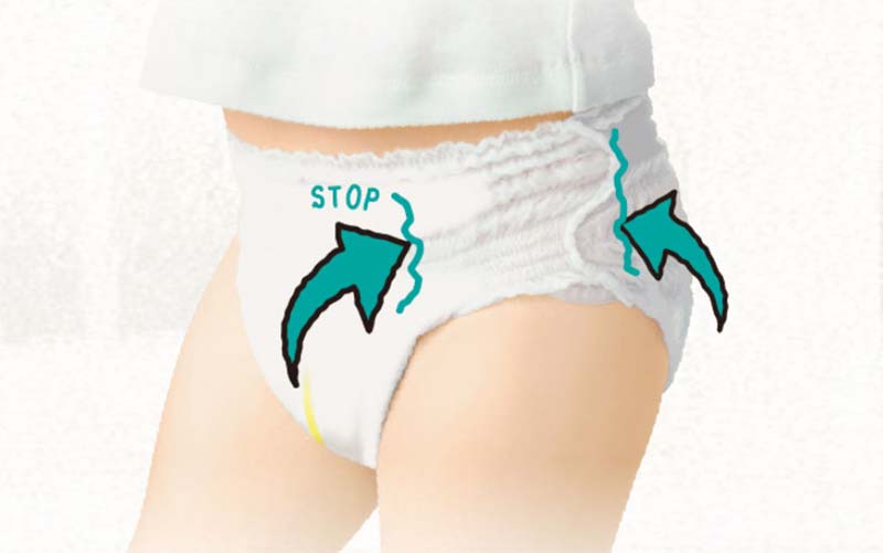ゆるうんちをキャッチする立体ポケットが付いているので、はいはい中の背中漏れを防いでくれます。テープタイプのムーニーで好評だった漏れ対策機能が、パンツタイプでも生かされているのは嬉しいですね。