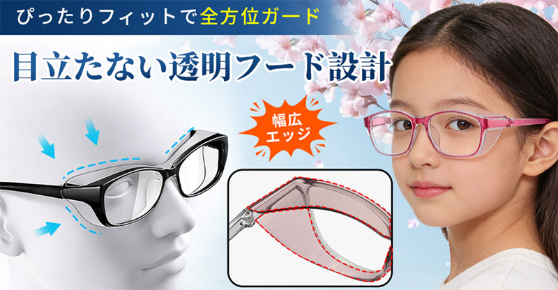 レンズと顔の間をフードでぐるっと覆うゴーグルスタイルで、花粉の侵入を物理的に抑える設計です。